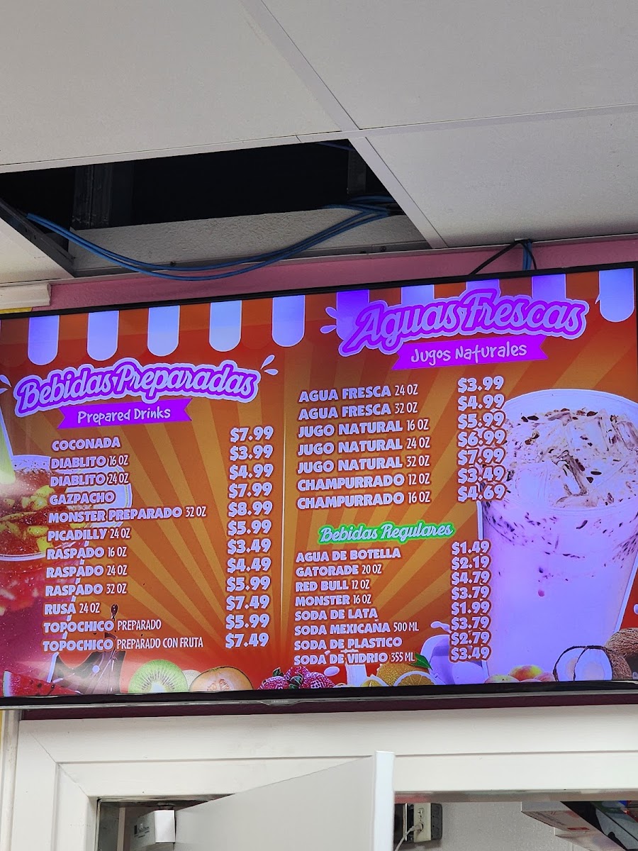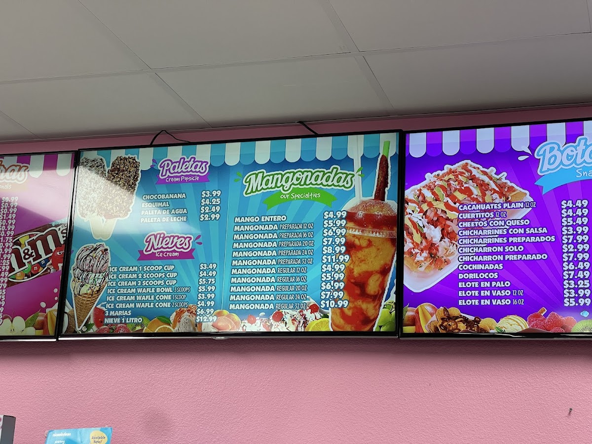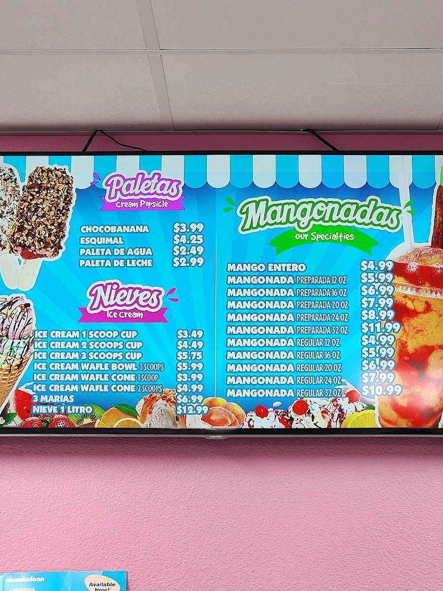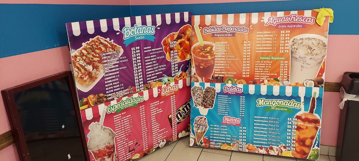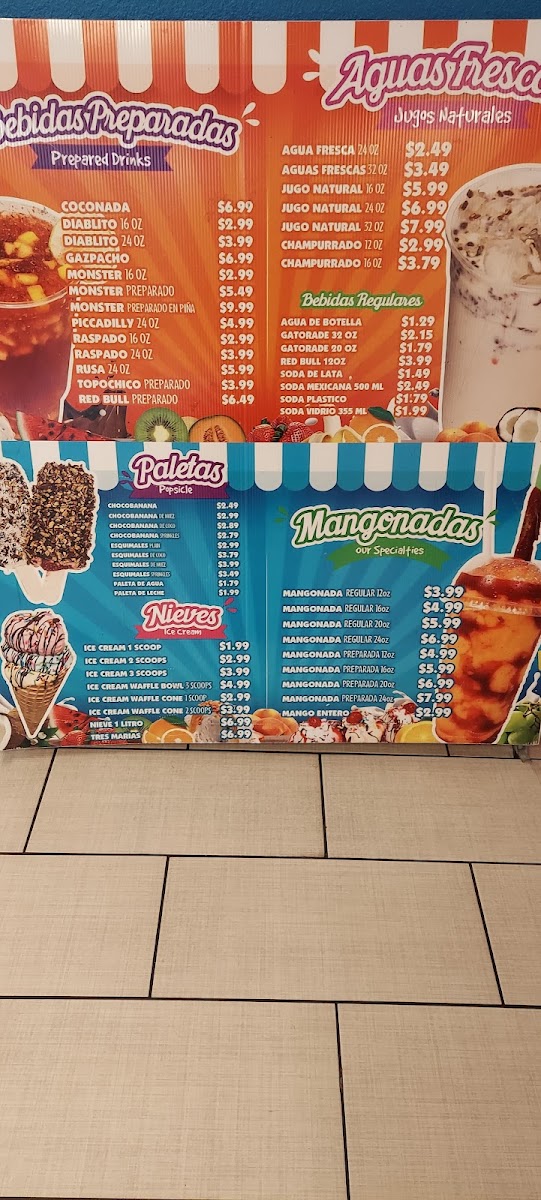 Las Mangonadas offers a vibrant and diverse menu that caters to a variety of tastes, blending traditional Mexican treats with refreshing beverages. The star of the menu is the Mangonada, available in three varieties: Mangonada Preparada, Mangonada Regular, and Mango Entero. For those seeking something lighter, the Aguas Frescas section features drinks like Champurrado and Agua Fresca, while the Jugos Naturales offer fresh juice options. The Especialidades range from sweet indulgences like the Bionico Con Nieve to savory options like Churros and Smoothies. If you’re looking to add a little extra flavor, Extras such as Coco, Wiped Cream, and Queso Amarillo can be added to your treat. The Bebidas Regulares section includes a variety of sodas, including the classic Soda Mexicana 500ml, as well as Red Bull (12 Oz.) for an energy boost. For a sweet snack, the Paletas like Paleta Napolitana and Esquimal De Pistacho are perfect, or you can indulge in some crunchy Botanas, such as Chicharron Preparado or Elote En Palo. The menu also features Bebidas Preparadas like the popular Monster Preparado (32oz) and the Piccadilly (24 Oz.) for those who prefer a more vibrant, flavored drink. Sweet treats abound with options like Pastel De 3 Leches 10" and Rebanada De Piña Colada. If you’re in the mood for something more substantial, the Comida section offers savory options like the Torta De Milanesa (Breaded-Beef Steak Sandwich) and Torta Chilanga. With such a wide variety of delicious and refreshing options, Las Mangonadas is the perfect spot to satisfy your sweet and savory cravings.