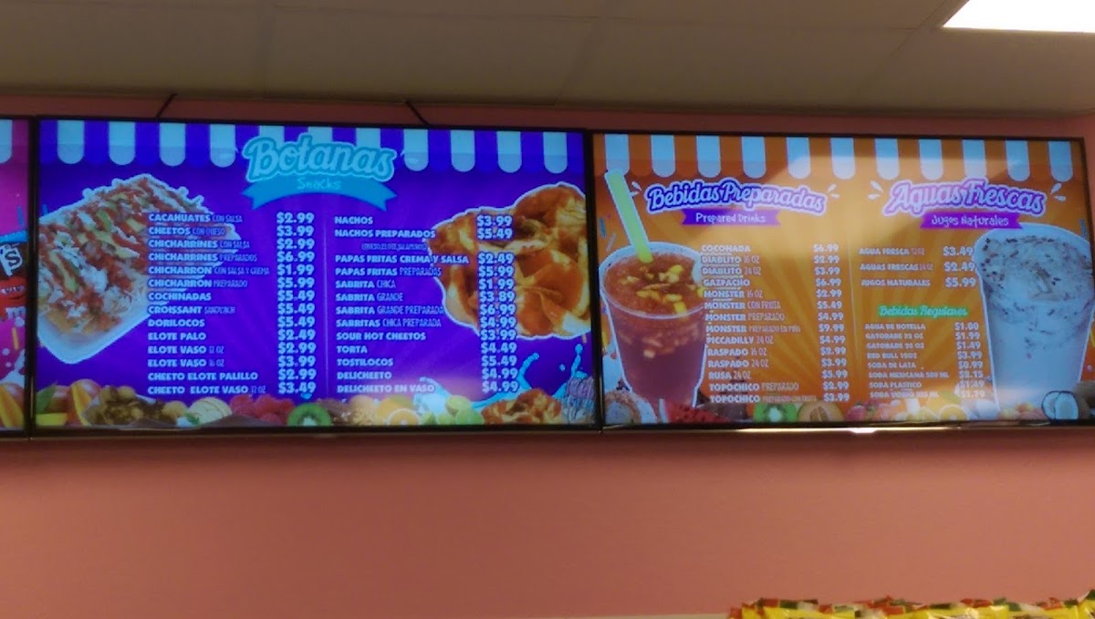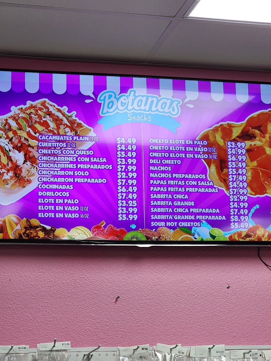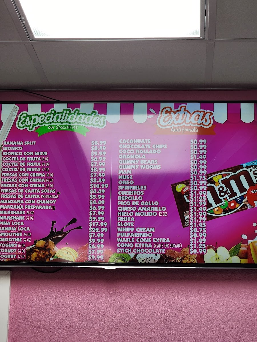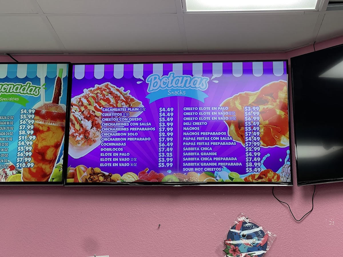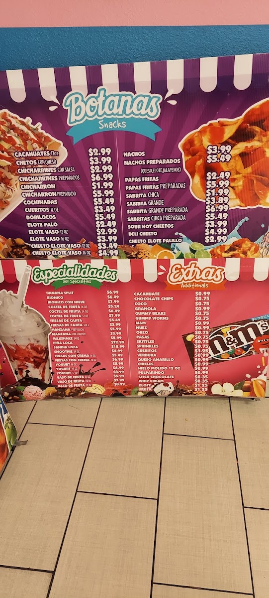 Las Mangonadas offers a vibrant and diverse menu that caters to a variety of tastes, blending traditional Mexican treats with refreshing beverages. The star of the menu is the Mangonada, available in three varieties: Mangonada Preparada, Mangonada Regular, and Mango Entero. For those seeking something lighter, the Aguas Frescas section features drinks like Champurrado and Agua Fresca, while the Jugos Naturales offer fresh juice options. The Especialidades range from sweet indulgences like the Bionico Con Nieve to savory options like Churros and Smoothies. If you’re looking to add a little extra flavor, Extras such as Coco, Wiped Cream, and Queso Amarillo can be added to your treat. The Bebidas Regulares section includes a variety of sodas, including the classic Soda Mexicana 500ml, as well as Red Bull (12 Oz.) for an energy boost. For a sweet snack, the Paletas like Paleta Napolitana and Esquimal De Pistacho are perfect, or you can indulge in some crunchy Botanas, such as Chicharron Preparado or Elote En Palo. The menu also features Bebidas Preparadas like the popular Monster Preparado (32oz) and the Piccadilly (24 Oz.) for those who prefer a more vibrant, flavored drink. Sweet treats abound with options like Pastel De 3 Leches 10" and Rebanada De Piña Colada. If you’re in the mood for something more substantial, the Comida section offers savory options like the Torta De Milanesa (Breaded-Beef Steak Sandwich) and Torta Chilanga. With such a wide variety of delicious and refreshing options, Las Mangonadas is the perfect spot to satisfy your sweet and savory cravings.